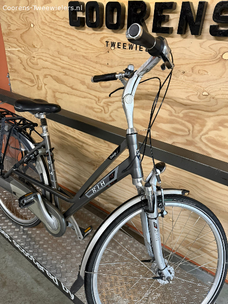Damesfiets met 8 versnellingen, handremmen, verende voorvork en zadelpen.
